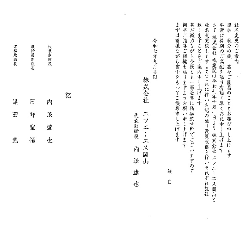 エフエーエスグループ「株式会社戎急配」は「株式会社エフエーエス岡山」へ社名変更いたしました